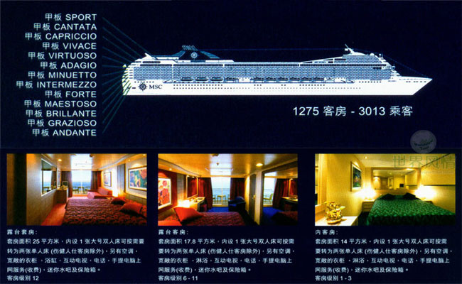 “音樂號”是地中海游輪公司第一艘九萬噸級巨型豪華游輪。2006年音樂號的下水,標(biāo)志著地中海游輪公司開始全面進(jìn)軍高端豪華游輪市場。音樂號充分體現(xiàn)了這家年輕的意大利游輪公司的特質(zhì),即對每艘游輪如同工藝品般的精雕細(xì)琢。船內(nèi)設(shè)施富有歐洲風(fēng)格,包括許多意大利特點(diǎn),簡單的線條和簡潔的家具設(shè)計,兼收并蓄的顏色和家具十分協(xié)調(diào),一點(diǎn)都沒有花哨的感覺。真木和大理石在設(shè)施中被廣泛應(yīng)用,這些高質(zhì)量代表了地中海游輪公司對船只未來的承諾。最新的雙鰭式平衡裝置,讓這座浮動的城市更加的平穩(wěn)。智能的能源節(jié)省及管理系統(tǒng)已經(jīng)成為了地中海游輪的標(biāo)準(zhǔn)配置,讓您在享受高品質(zhì)生活的同時也能積極倡導(dǎo)和奉行高尚的環(huán)保理念。全船1259間客房,5個餐廳,9個酒吧,13部客運(yùn)電梯,1個面積超過2000平方的戶外游泳池以及1個室內(nèi)恒溫游泳池,健身房,水療室以及大量的休閑娛樂設(shè)施,加上地中海游輪公司人性化的貼心服務(wù),一定會讓您感覺不虛此行!