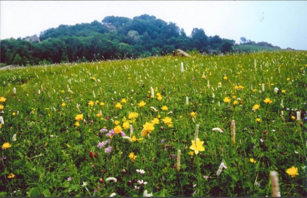 百花山海拔將近兩千米,寬闊平坦,保留著亙古時期寒冷氣候條件下形成的古“石海”、冰緣“城堡”和冰辟巖柱。我們享受著這高山上的百花草甸,奔跑在齊膝甚至齊腰深的綠草與山花叢中,勺雞、褐馬雞、黑鸛的叫聲和著我們的歌聲,不時還有斑羚、野鹿躥出來。