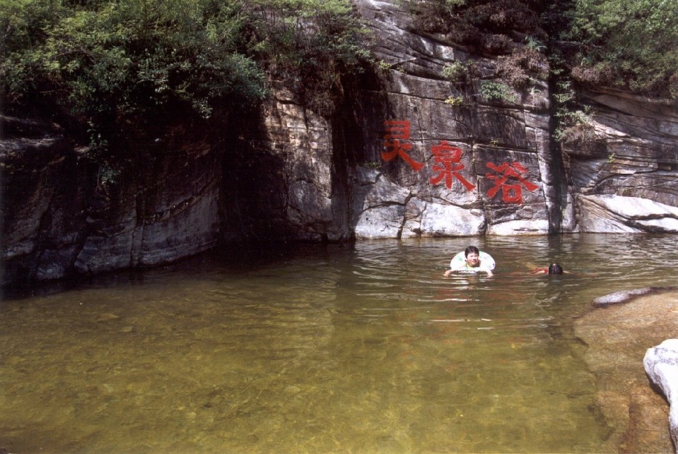 精靈谷是大山深處的天然幽谷,眾多的山泉流成溪,終年不斷。谷壁懸崖聳立,谷底潺潺流水,溪水流聚成個(gè)個(gè)小潭,清澈見(jiàn)底。走在山間,經(jīng)常可以看見(jiàn)一些巨石,相態(tài)各異,姿態(tài)完全,其中一塊比較吸引我,宛如一只大龜矗立在山頭,似乎在遙望著什么,有似乎是在盼望著什么,后來(lái)得知,那塊石頭的名字叫金蟾戲龜,可能是角度的問(wèn)題吧,只能看見(jiàn)龜?shù)臉幼?,并看不到金蟾在哪,不過(guò)一想這龜那么的迷茫在尋找著什么,估計(jì)肯定是被金蟾給戲弄了。走近山谷里,驚奇的發(fā)現(xiàn)有一潭幽靜的潭水,走進(jìn)便知,原來(lái)名字叫做“靈泉”,叮咚的谷水,從石頭的縫隙中涌出,流入這幽靜的潭里,清涼,透徹,在這綠樹(shù)環(huán)抱中,顯得格外的清心,真想飛身一躍跳進(jìn)這潭水里暢游一番,但是又不忍心打破這份寧?kù)o,還是在邊上洗了把臉,感受一下這酣甜的泉水帶給我的涼意了。