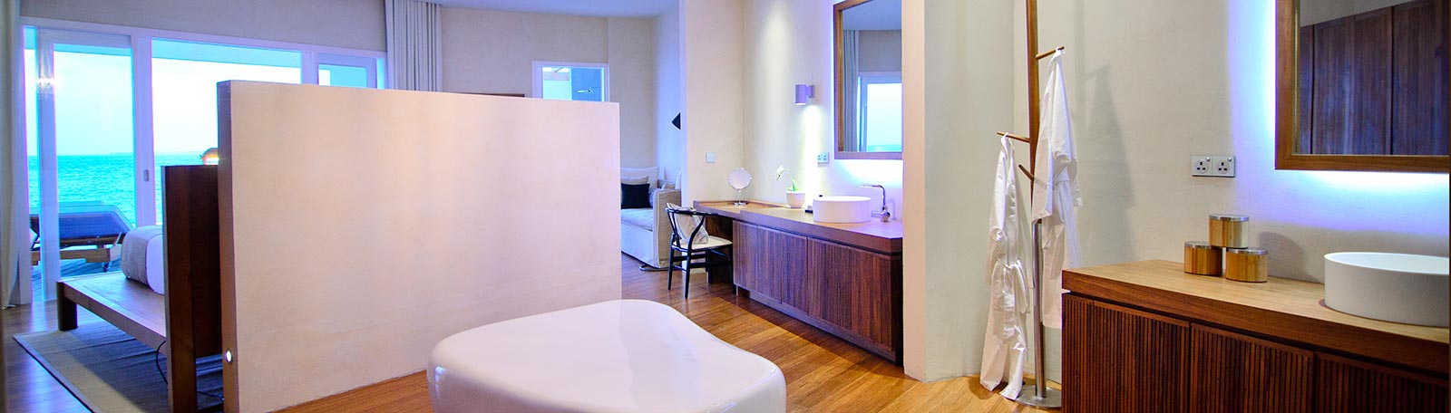 當(dāng)您在我們的海洋水上屋內(nèi)午休時,從您自己的室外露臺或淡水泳池都可以欣賞到令人著迷的海景和青綠色的環(huán)礁湖。那里是日光浴、休閑和用餐的完美之地?,F(xiàn)代、時髦的房屋海洋水上屋內(nèi)設(shè)空調(diào)且能夠直接通達(dá)大海。
