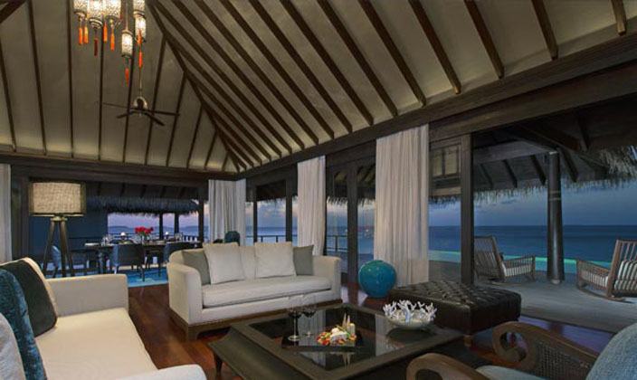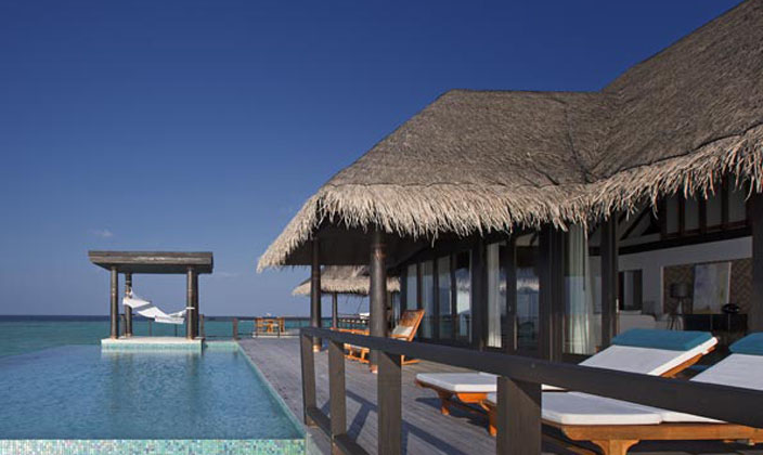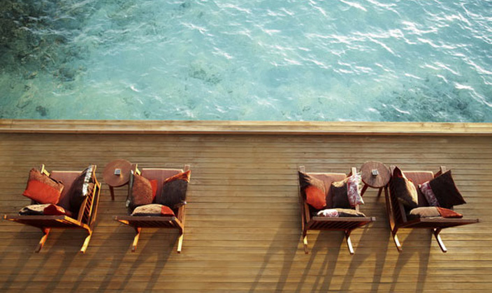 水上別墅能帶您他體驗水生活的魅力,用條紋木材搭成而建在水上,并配有挑高的天花板和硬木地板的水上泳池別墅讓您感覺仿佛置身于大海之中。從你的私人游泳池欣賞令人眼花繚亂不斷變化的天空和馬爾代夫夕陽戲劇。浴室設(shè)有凹陷的玻璃底浴缸吸收下面波光粼粼的海景,甲板還有一個超大的的無邊泳池。