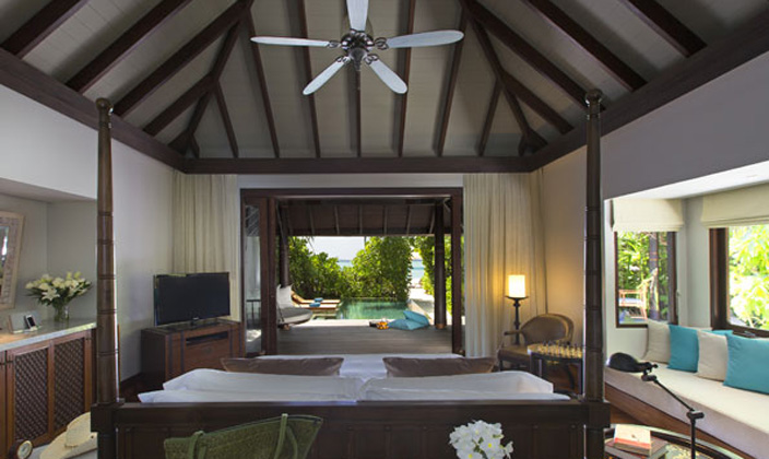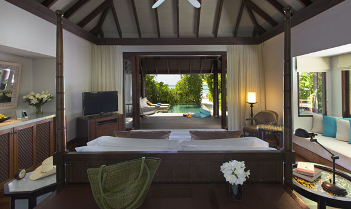 別墅主臥室擁有豪華的特大雙人床,浴室設(shè)有室內(nèi)和戶外沐浴,以及嵌入淺水池中的露天浴缸。第二間臥室擁有兩張單人床和一張沙發(fā)床,相連的第二間浴室設(shè)有半室內(nèi)和戶外淋浴。兩間臥室皆通往寬敞的日光甲板,一家人可以在躺椅上休憩,在四面敞開的用餐亭中共享美食,或是在延展至白色柔軟沙灘的大型無邊泳池玩耍。