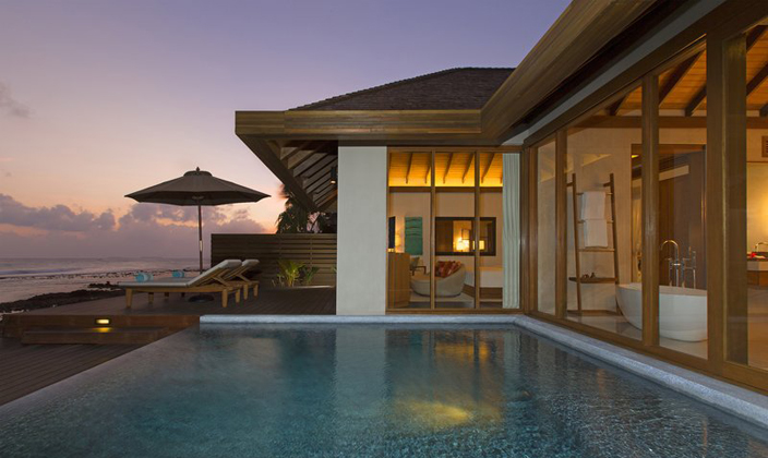 棲息在隱秘的懸崖邊緣,直面碧波蕩漾的印度洋,每棟海景泳池度假小屋都擁有125平方米寬敞的室內(nèi)和室外空間,輕松漫步即可來到海灘和潟湖。硬木地板、海島風(fēng)情內(nèi)飾以及各種招牌舒適,這些迷人靜居充滿親密天然的風(fēng)格,更有無敵海景相伴。 在鋪著精美床單的豪華特大雙人床上酣然入睡。 步入舒適的空調(diào)浴室,泡在寬大浴缸里盡情放松,耳邊播放最愛的iPod曲目。 寶藍(lán)色的海水和層層疊起的波浪,透過室內(nèi)的落地玻璃窗即可欣賞這般一覽無遺的美景。 在室外品味相同的絕美風(fēng)景,感受溫柔海風(fēng)拂過臉龐。 來到露臺(tái),靠在躺椅上曬曬太陽,細(xì)細(xì)品味小吧臺(tái)的美酒。 或者在唯您獨(dú)享的寧靜世界里,在私人跳水池里暢游一番。