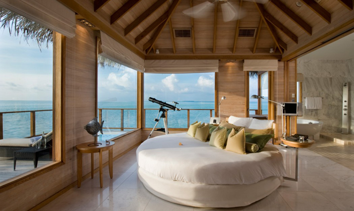 日落別墅曾經(jīng)是皇室成員、名人顯要及世界頂級運動明星的下榻之地。透過起居室的玻璃地板,形態(tài)各異的海洋生物盡收眼底。房內(nèi)圓床更可270度旋轉(zhuǎn),追逐美得令人窒息的日落勝景。