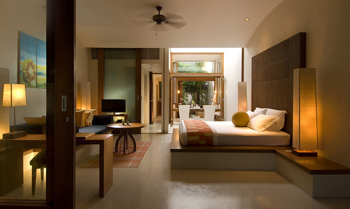 以玻璃為墻的臥室是一大特色,可直接通往露臺與小型私家花園,花園之外可直達海灘。別墅后方是噴泉庭院與露天花園涼亭浴室,茅草為頂、超大浴缸、情景照明,處身其中,如夢如幻,浪漫非凡。對于舉家旅行或約友共游的賓客來說,11間連通別墅帶來了靈活與便利的入住選擇。
