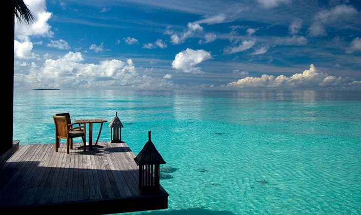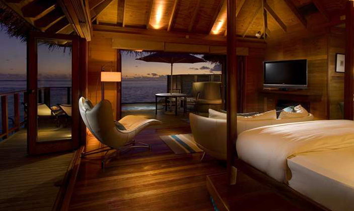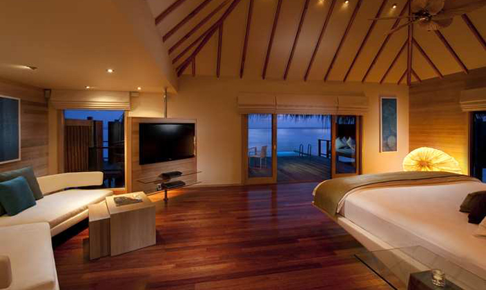 提供日光浴與無限池,沉沒浴缸,浮床。這個別墅是建立在高蹺上的水和室外陽臺與大無邊泳池。日光浴甲板上還具有木制太陽傘和躺椅,咖啡桌。甲板上有一個凹陷的泳池,和一個50寸的等離子電視??照{(diào)別墅還帶有一個冷藏迷你酒吧,iPod連接器和一系列的沐浴產(chǎn)品CD音響。