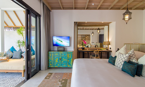 在豪華的熱帶花園特色的綠松石Finolhu瀉湖和太陽(yáng)椅和花園寬敞的室外用餐露臺(tái)私人海灘,210平方米的摩爾風(fēng)的海灘別墅,配備了40英寸純平電視,私人葡萄酒和迷你酒吧。