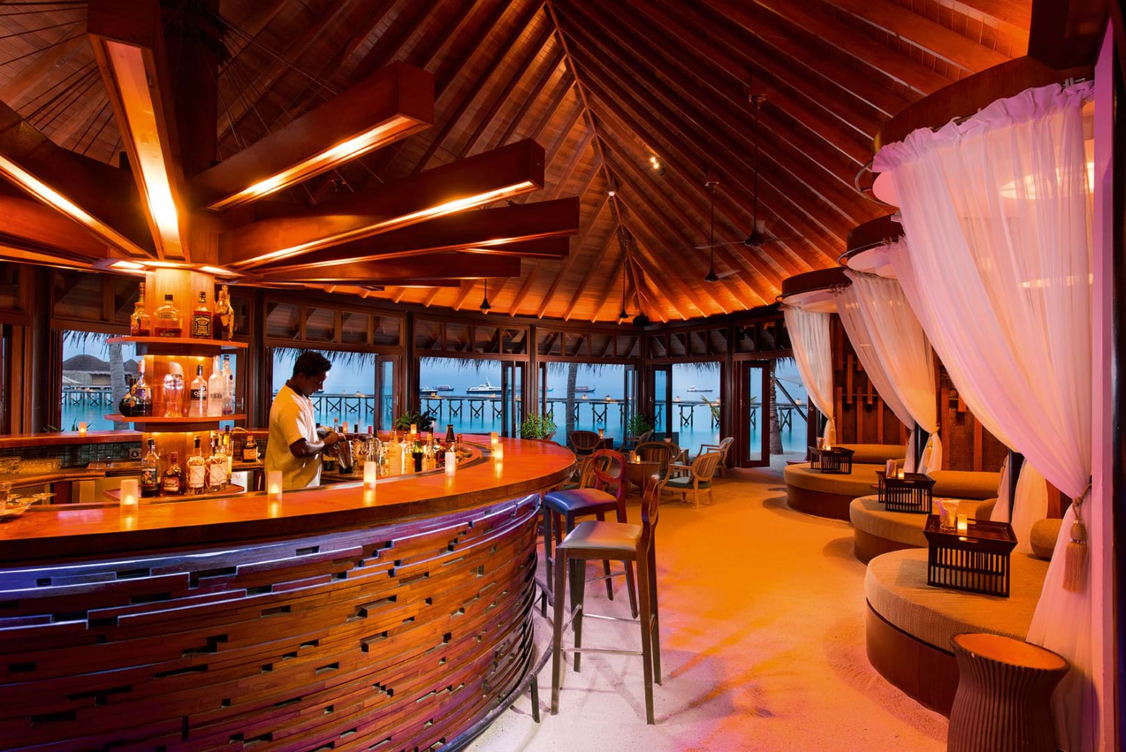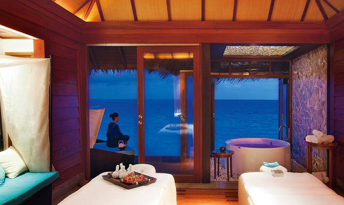 所有的理療室均設(shè)在白沙青水的印度洋上,鄰近碼頭,每間理療室均有一個廣闊的視野,可以穿過礁湖到陸地上。 營業(yè)時間:9:00am - 9:00pm 設(shè)施: 6 間單人理療室 蒸汽室 3 間雙人理療室 冷熱游泳池 1 間印度草藥室和4間理療室 娛樂區(qū) 1 間泰式理療室 桑拿 "海洋沙龍"美發(fā)(洗、吹、新娘妝和造型) 瑜珈、按摩浴池 美甲 精品水療提供細(xì)膩的手法和天然的護(hù)理產(chǎn)品