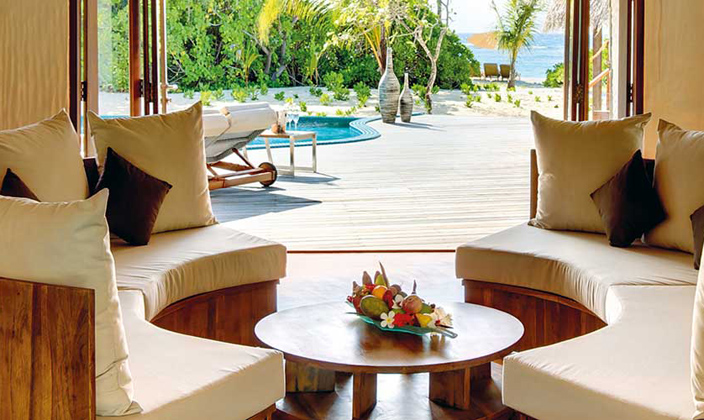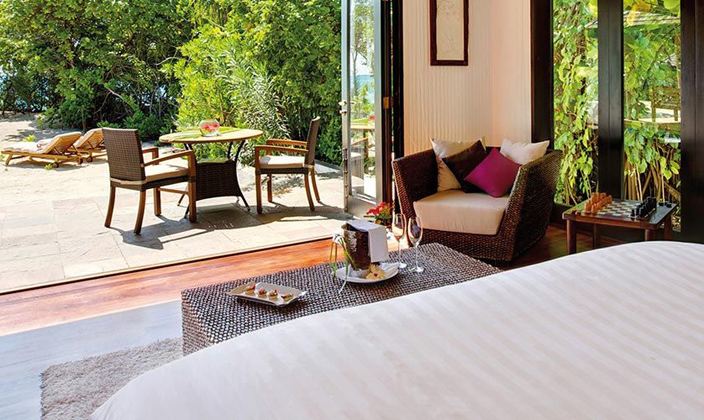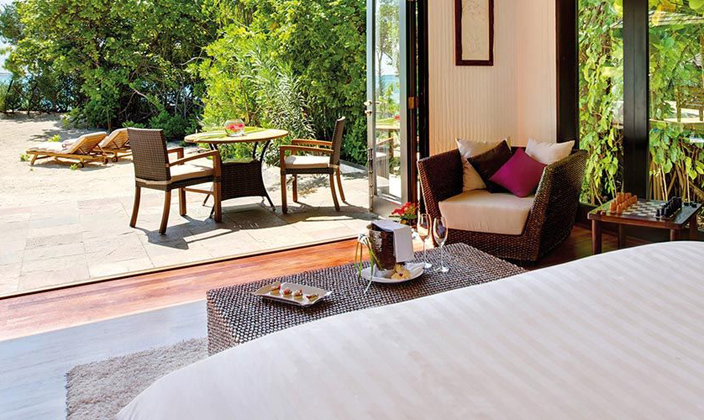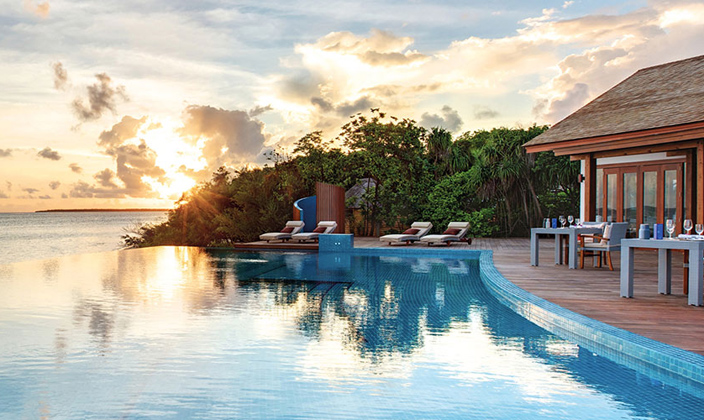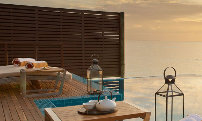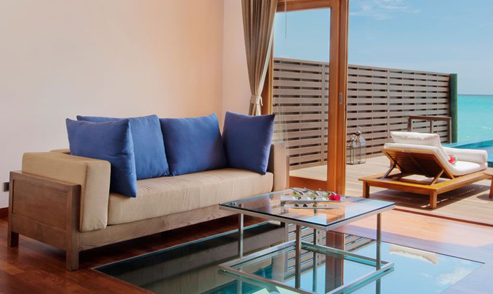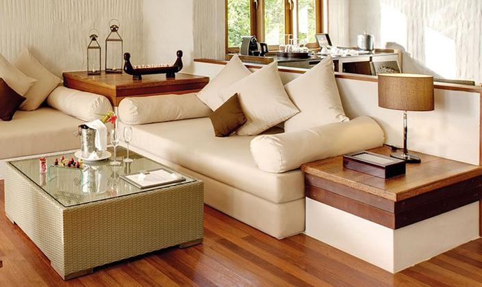 該套間立于清透的湖水中的木制腳柱上,雙臥房,雙衛(wèi)生間,這一切使海景套間成為蜜月度假的首選。起居室和餐室舒適典雅,別墅用餐區(qū)的日光臺(tái)上可以欣賞無(wú)盡
