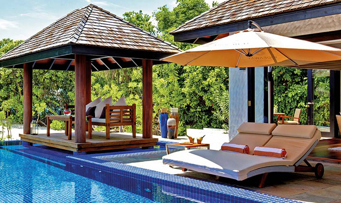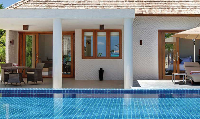 雙臥室的家庭別墅坐落在原始的島嶼環(huán)礁湖邊的海濱地區(qū),每間別墅都配 53平方米的專(zhuān)屬游泳池。此外還包括可俯瞰游泳池和海灘的露天平臺(tái)、戶(hù)外座椅區(qū),更衣間,一間寬敞的室內(nèi)/室外浴室,均裝有“雙人使用”的手工按摩浴缸,起居室也配備有客用洗手間和淋浴間。