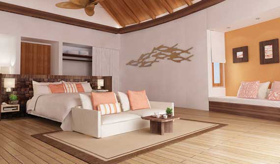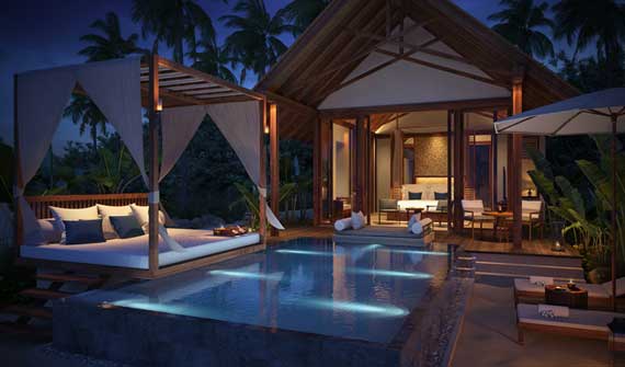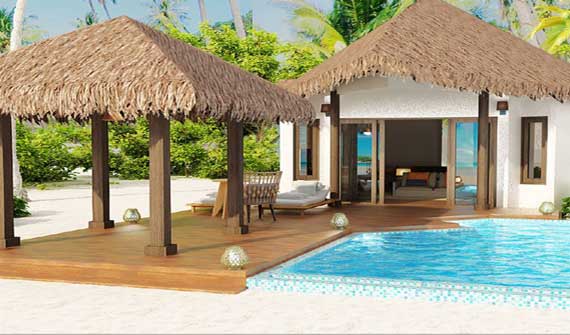 全島共有15間海灘泳池別墅,配備一個(gè)特大號(hào)雙人床,坐息區(qū),木質(zhì)地板和洗漱區(qū),空調(diào),吊頂電扇,私人保險(xiǎn)箱,國(guó)際 直撥電話和私人日光曬臺(tái),配備海灘躺椅和桌椅。房?jī)?nèi)有葡萄酒小冰箱,迷你酒吧,意式咖啡機(jī)和免費(fèi)茶及咖啡。