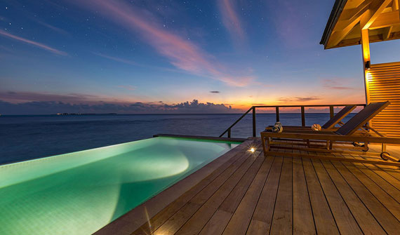 全島共有15間海洋泳池別墅和15間日落海洋泳池別墅,海洋泳池別墅朝向日出方向,日落海洋泳池,別墅可以欣賞到美麗的馬爾代夫日落美景,帶私人無(wú)邊泳池。