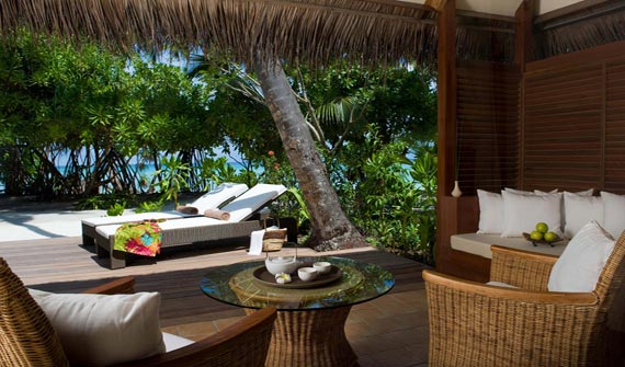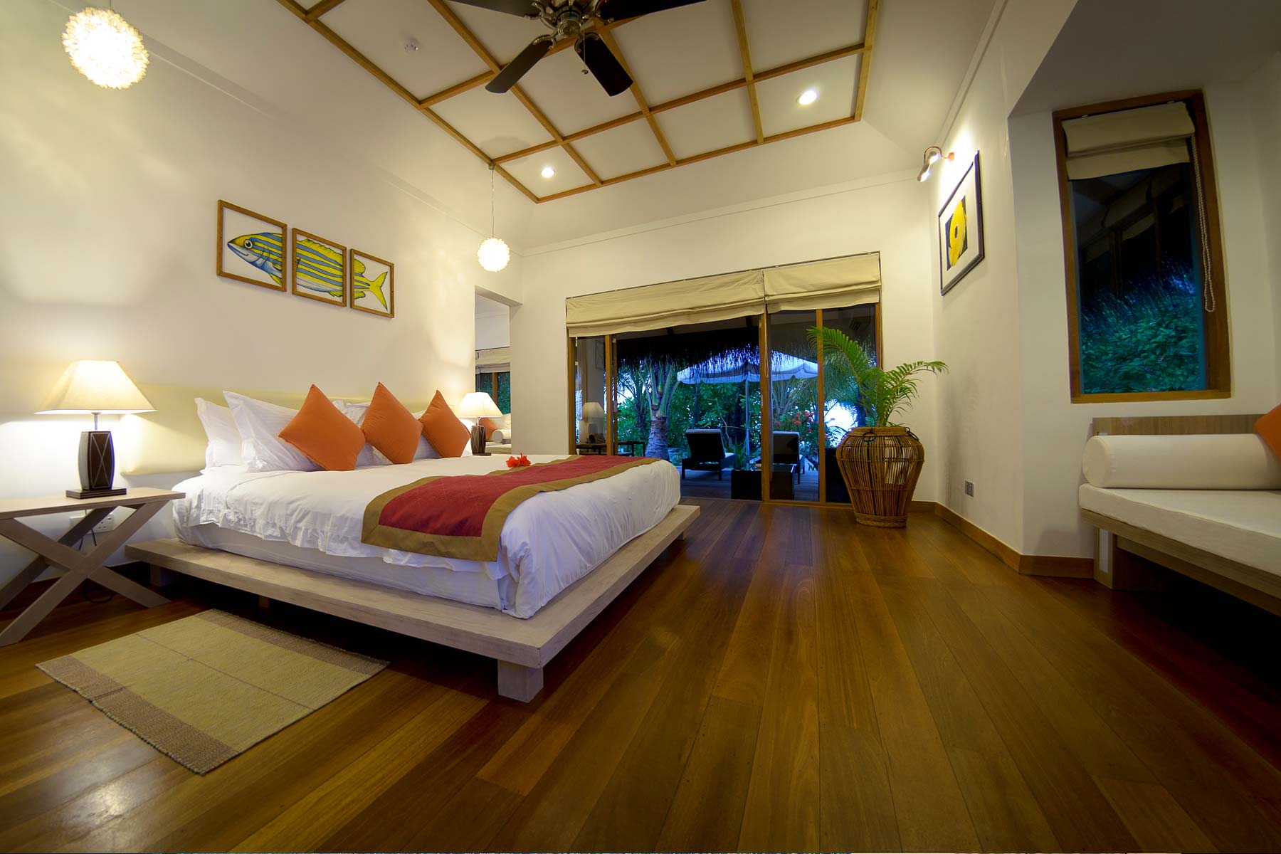 海灘別墅是隱藏在茂盛的植物中的獨立別墅,距離海灘只有幾步之遙。這些別墅面對島上的瀉湖側(cè),設(shè)有特大四柱床,寬敞的木質(zhì)甲板的前部有沙發(fā)床和躺椅。海灘別墅還包括半露天的浴室,設(shè)有戶外花灑淋浴。