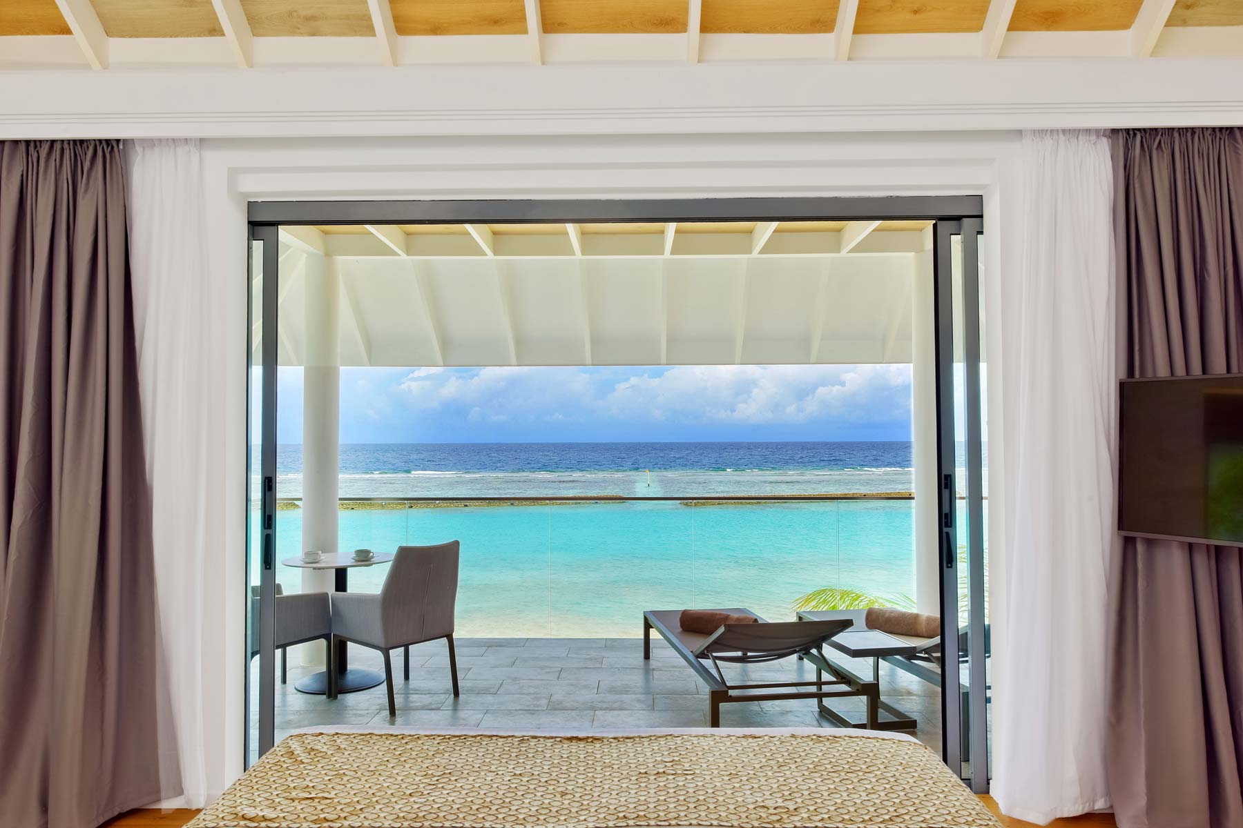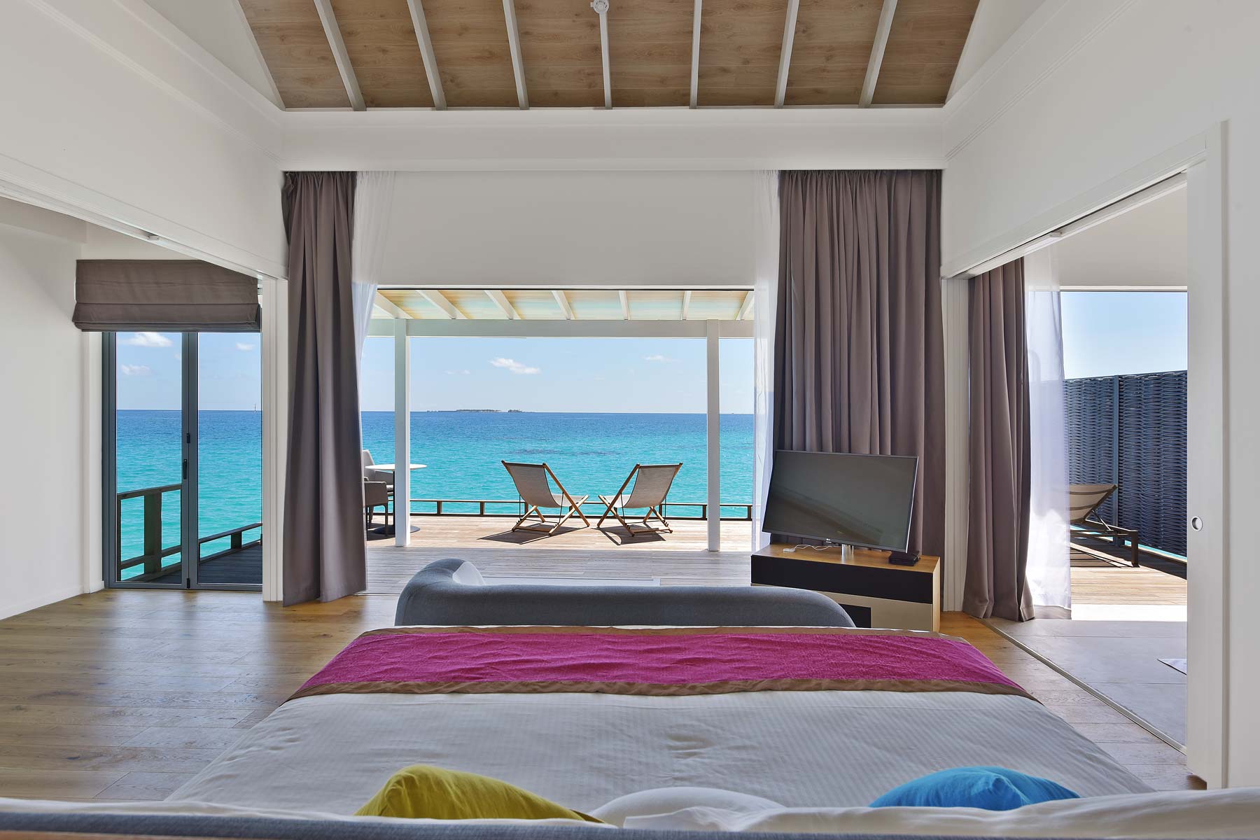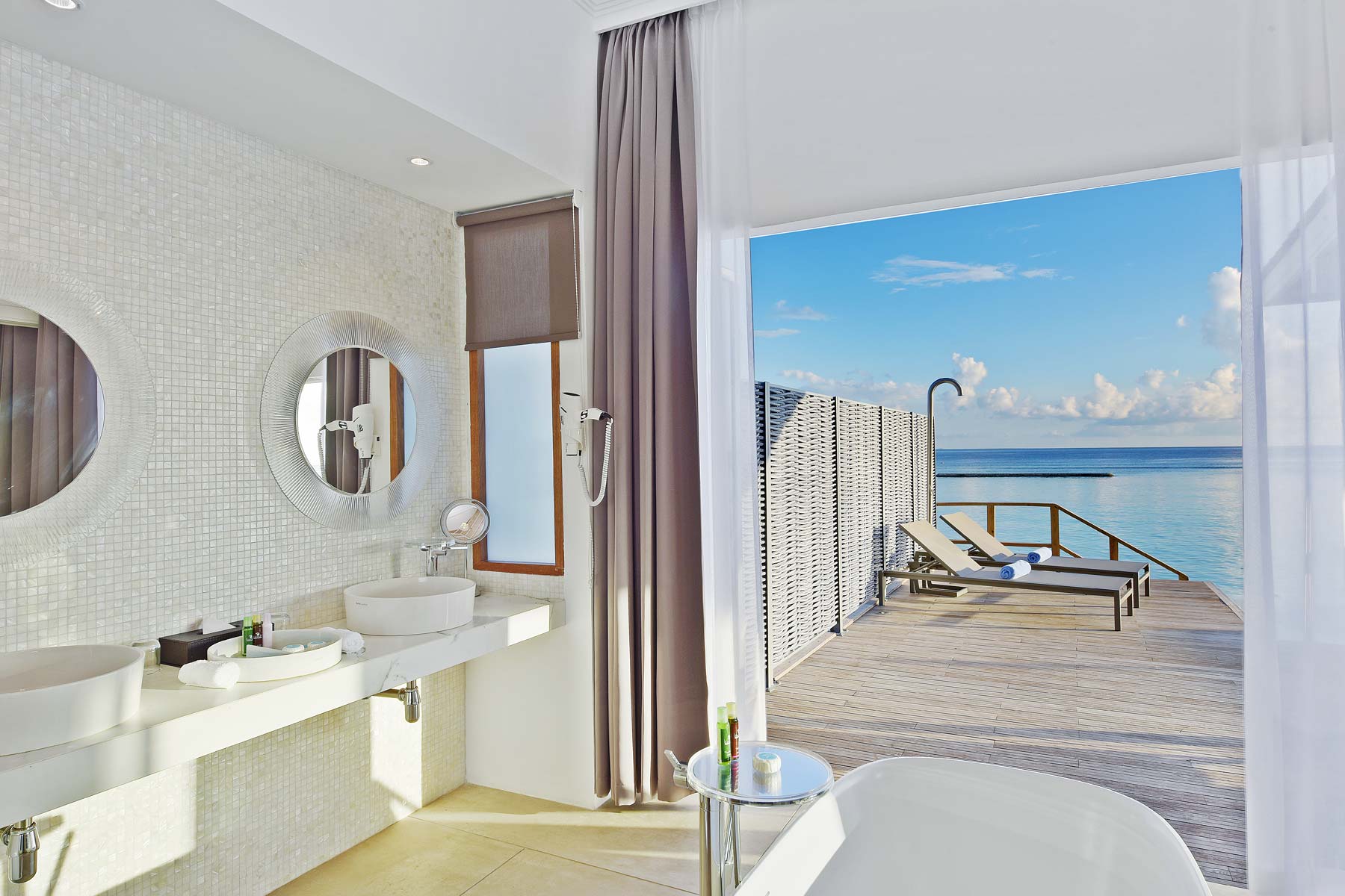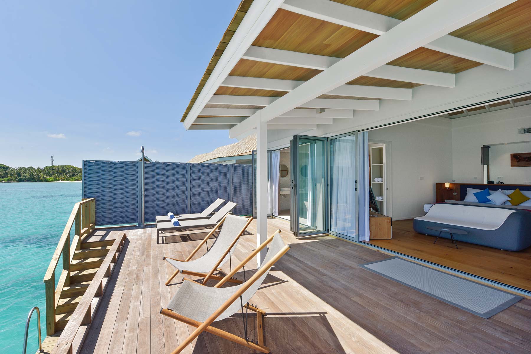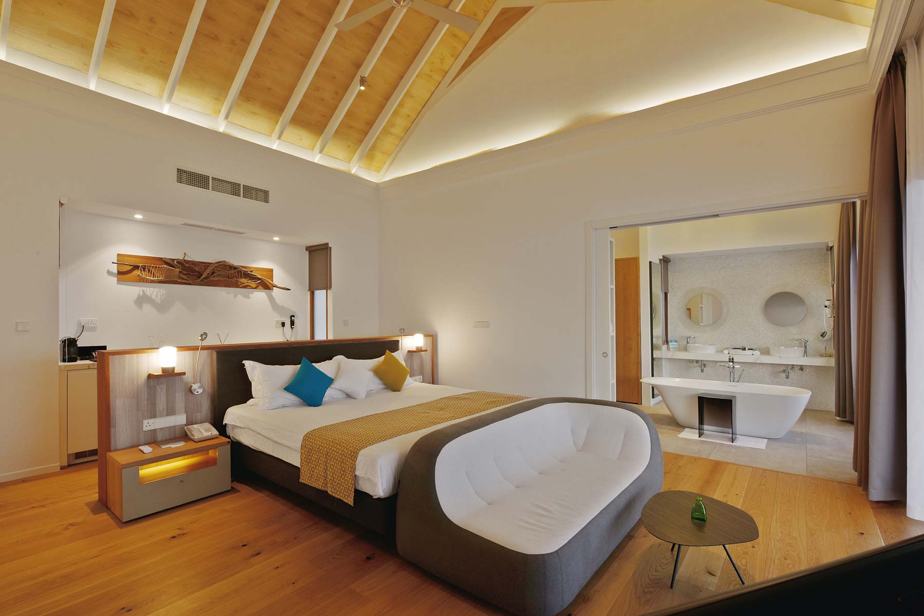 豪華水上別墅的特征一個特大號床和沙發(fā)床,寬敞的浴室提供獨立的浴室。享受悠閑的海上日光。