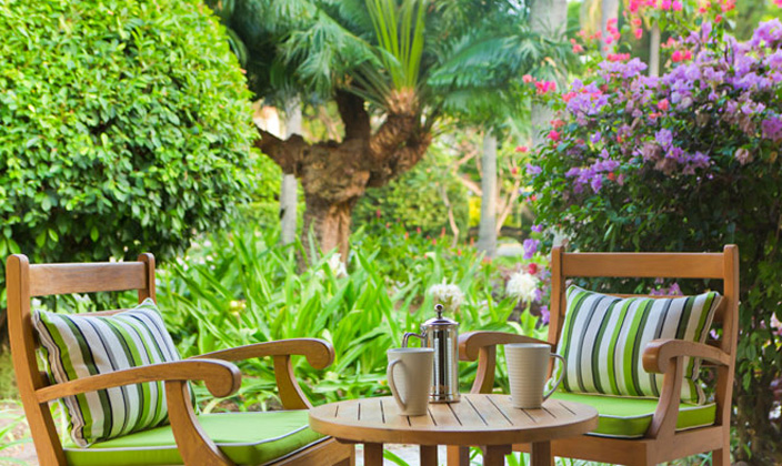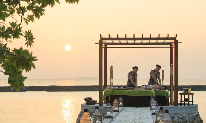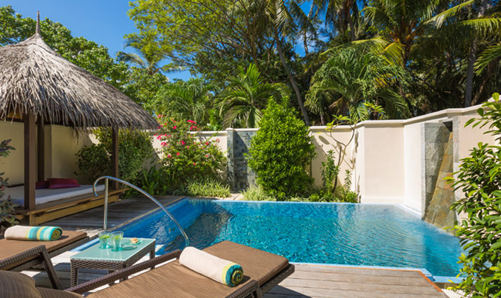 每間都有泳池,花園圍繞的高級按摩浴缸以及具有療效的按摩步道。有優(yōu)美的小瀑布、露天淋浴及有草亭遮蔭的雙人躺床,私人庭院設有唯一從海灘通往日光場浴池的入口。