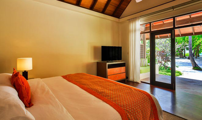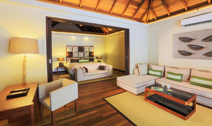 兩間豪華的臥室包含兩個游泳池,設有寬敞海岸平臺可以俯瞰沙灘。由院門入口進入房間,會穿過一個裝飾優(yōu)美的水池庭院,水池兩側(cè)各設有一個茅草亭。內(nèi)院可通過休息室及客廳,還附有儲物間和客用洗手間。