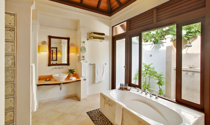 開放式的花園衛(wèi)生間配以超大的浴缸,讓您感覺仿佛在花園中沐浴。腳下的沙石給您帶來一絲清涼,躺在戶外的沙發(fā)床,陽光從樹葉間透過,在波光粼粼的大海中暢游。這就是您夢寐以求的馬爾代夫獨棟平房。