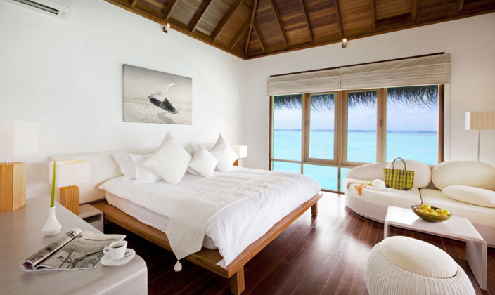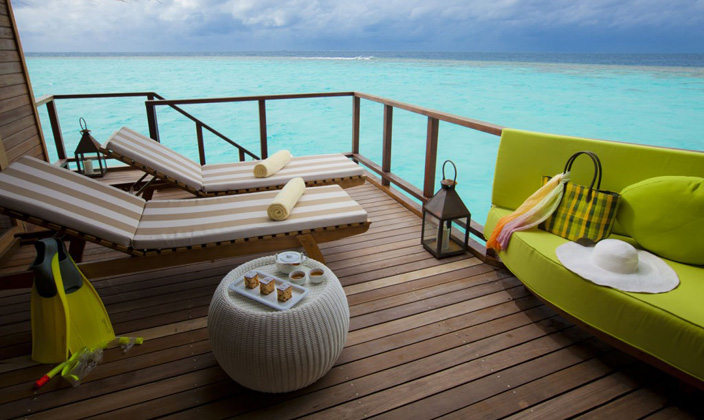 這些宏偉的別墅建在水上,每一個水上別墅完全是私人的,碼頭有私人通道可直接進入,別墅外是私人的木制甲板躺椅休息區(qū),從那里你可以看不同顏色的熱帶魚游泳,也可以直接從樓梯處下海。