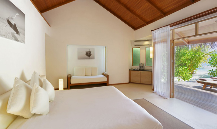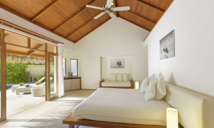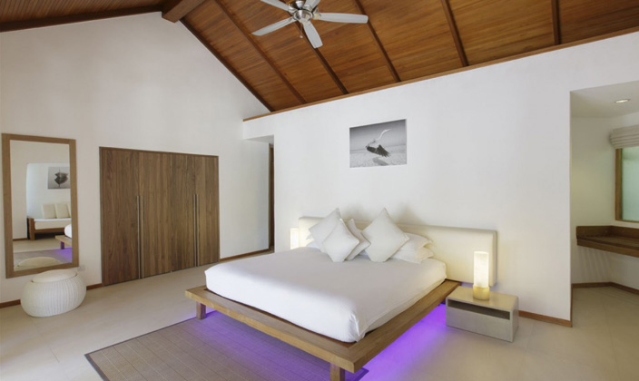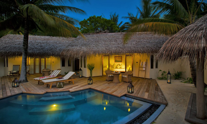 散落在高蹺藍色瀉湖上從私人木制甲板可以直接進入海水中,兩個海灘別墅之間共享私人游泳池每個泳池別墅都有一個共同的入口走廊和一個單獨的餐廳館。