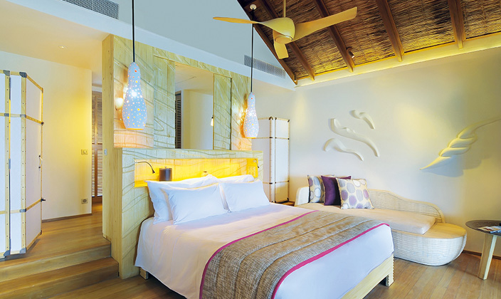 房間面積相當(dāng)大,帶私人泳池,島上的沙灘一級棒,該島另一大特色就是水上別墅的水滑梯是其一大特殊體驗,別墅臥室設(shè)計...
