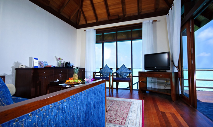 總統(tǒng)水上別墅可提供無障礙的遼闊視野和完全的私密空間。套房融合了現(xiàn)代設計和傳統(tǒng)馬爾代夫式建筑風格。房中有兩間臥室,屋外是雙層式柚木陽臺,第一層陽臺設有私人泳池和露天按摩浴池,第二層陽臺上有可供直接下海浮潛的樓梯。