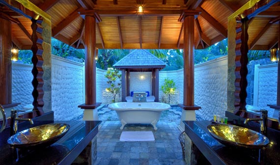 按摩浴缸水上別墅位于島邊緣的海上區(qū)域。房內設施與豪華水上別墅基本相同,區(qū)別在于寬敞的私人露臺上有個按摩浴缸。從露臺上可以看到海上的珊瑚礁。浴室面積約為普通房間浴室的兩倍。