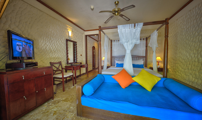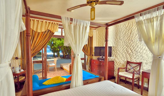 一棟客房有上下兩層共4個套房,都是面海而建,有露天陽臺。陽臺離海很近,站在陽臺上就可以俯視珊瑚海灘和瀉湖的美景。房中有起居室和寬敞的衛(wèi)浴室,還包括舒適大床、沙發(fā)和衛(wèi)星電視等。