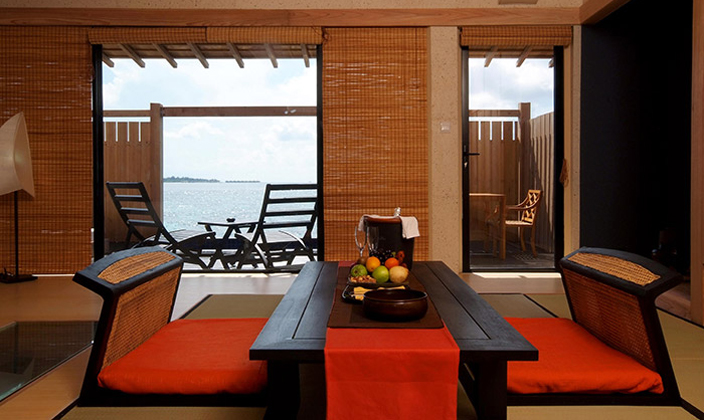 水上日式別墅以傳統(tǒng)日本建筑為設(shè)計(jì)理念,以追求奢華、隱秘住所的賓客需求為標(biāo)準(zhǔn)精心構(gòu)建而成。室內(nèi)裝潢的色調(diào)能夠舒緩情緒,美觀宜人,家具的位置經(jīng)過(guò)精心擺設(shè),散發(fā)出原汁原味的日本情調(diào)?;胍患珴甚r艷的和服,想像自己穿越到了古代日本居住沖繩海岸的傳統(tǒng)民家。擁有寬敞走廊的日式別墅棲于瓦度島綠松石般的水域上。