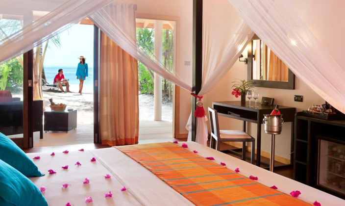 位于海灘上,半露天浴室與雙水槽、還有一個小的熱帶花園沙灘上寬敞、獨立的別墅,有漂亮的瀉湖景觀,四柱床,瓷磚地,露天浴室,小的熱帶花園。