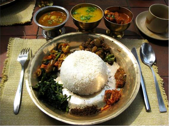 尼泊爾菜只是印度地方性烹調的變化而已,其中還包括一些西藏改變而來的飲食。稻米是尼泊爾絕大部份的地方,包括加德滿都谷地在內的主食。通常是煮來吃,再配上扁豆湯(dhal),炒菜時加一些佐料(主要是大蒜和紅椒)。山區(qū)居民吃ampa甘裸,磨碎后和茶、牛奶或水混合,或是干吃----作為米飯的補充或代替品。在這個視牛為圣物的印度教王國里,牛肉是不準吃的,因為在印度教里牛是濕婆神的使者,是神圣不可侵犯的。
