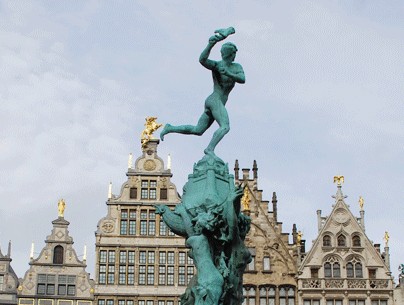 矗立在安特衛(wèi)普大廣場中心,安特衛(wèi)普市政廳前的布拉伯噴泉(Brabo)中間的雕像,表現(xiàn)的是安特衛(wèi)普名字的由來——“安特衛(wèi)普”來源于荷語“handwerpen”,即扔掉手掌的意思,這也就是著名的安特衛(wèi)普紀(jì)念碑。
