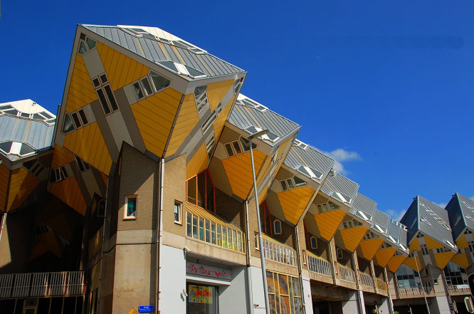 荷蘭人皮伊特•布洛姆則把建筑也變成了“魔方”。即使在布拉克(Blaak)地鐵周?chē)默F(xiàn)代建筑群中,立體方塊屋也是獨(dú)樹(shù)一幟的。布洛姆將自己的設(shè)計(jì)看作一棵樹(shù),將整個(gè)建筑群看作一片森林。布洛姆希望在大城市內(nèi)建造一個(gè)村莊,一個(gè)功能多樣的安全港。遠(yuǎn)觀立體方塊屋,只見(jiàn)一個(gè)個(gè)巨大的立方體連接在一起,每個(gè)立方體呈45度角傾斜,僅靠一個(gè)角像單臂倒立似的站立在一個(gè)六角形的柱子上。