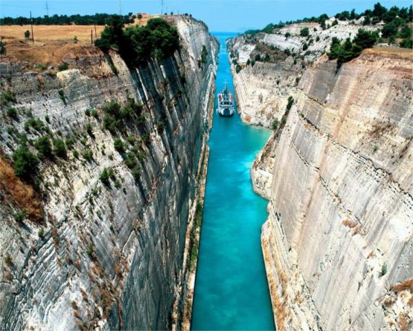 科林斯運(yùn)河穿過(guò)被稱(chēng)為科林斯地峽的一小段陸地,它提供了一條從愛(ài)琴海到伊奧尼亞的海捷。從遠(yuǎn)處看,運(yùn)河像一條狹窄細(xì)長(zhǎng)的水道,但當(dāng)船只逐漸靠近并進(jìn)入運(yùn)河以后,它的規(guī)模才顯現(xiàn)出來(lái)。然而,對(duì)于容納現(xiàn)代航運(yùn)中的超級(jí)油輪和集裝箱船而言,這條運(yùn)河還是太小了。