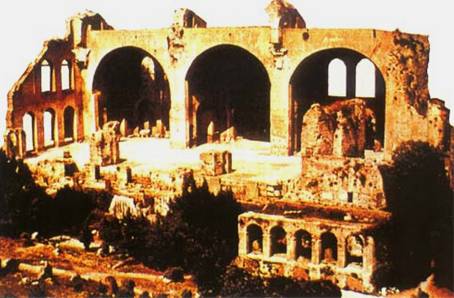 巴西利卡意思是長(zhǎng)方形會(huì)堂。該建筑始建于公元306年—310年,由君土坦丁大帝于公元312年—337年完成,是古羅馬筒狀穹窿建筑的代表作,今尚存北邊三個(gè)巨大的穹窿。整個(gè)建筑平面呈矩形,穹窿及其支撐結(jié)構(gòu)顯得莊重,具有紀(jì)念性,因此,這種巴西利卡也就成為后來基督教建筑的一種模式。