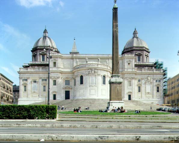 內(nèi)部的36根圓柱是從古代羅馬的神殿搬來(lái)的,以列柱支持水平梁是典型的初期基督教教堂建筑手法,主殿祭壇描繪舊約圣經(jīng)36個(gè)場(chǎng)景的鑲嵌畫(huà)是5世紀(jì)基督教初期的遺物;圓頂上閃耀著13世紀(jì)的金色鑲嵌畫(huà)《圣母加冕》,2樓走廊后面也有13世紀(jì)的鑲嵌裝飾;1377年建造的鐘樓高達(dá)75米,是羅馬之冠;右側(cè)西斯托5世的禮拜堂是文藝復(fù)興后期的,左側(cè)帕奧里那的禮拜堂是17世紀(jì)初期巴洛克藝術(shù)風(fēng)格的;最后,教堂的正立面是18世紀(jì)興建的,具有典型巴洛克風(fēng)格。