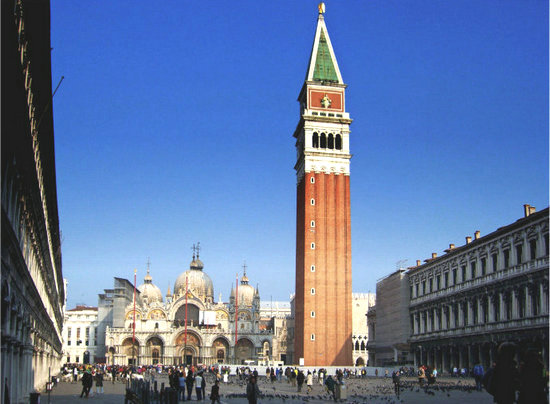 今日所見的鐘樓,取代了1902年倒塌的那座。登鐘樓頂層可俯瞰全城風光。鐘樓頂部與背后的圣馬可大教堂(Basilica San Marco) 鐘樓下部——前廊于16世紀由珊索維諾興建,其古典風格的雕塑,與共和國的光彩相輝映。