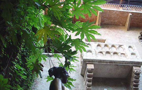 維羅納望族卡普雷提家族(Capulet)所有,朱麗葉即卡普雷提家族的女兒。故居中最顯眼的就是羅密歐與朱麗葉約會的陽臺,當(dāng)年朱麗葉佇立在陽臺上,羅密歐就是在下面對她傾訴了自己的愛慕之情,并爬上陽臺開始了一段傾城之戀。如今,這座陽臺爬滿了綠油油的藤蔓,陽臺下方的紅磚墻上粘滿了游人用口香糖貼住的情書,有許多是獻(xiàn)給自己的戀人表達(dá)忠誠的,更多的是遙寄給心中的完美情人朱麗葉的,當(dāng)?shù)卣疄楸苊庠絹碓蕉嗟男偶采w整個墻壁,組織了一個名為“朱麗葉俱樂部”的機(jī)構(gòu),由志愿者們專門代朱麗葉回信,來自世界各地的情書都能得到朱麗葉的回復(fù),每年情人節(jié)還舉辦“親愛的朱麗葉”最佳情書征集活動,影響廣泛。
