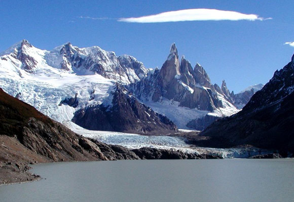 雖然現(xiàn)在是夏季,可遠(yuǎn)處高山上仍然白雪皚皚,終日被霧氣環(huán)繞。融化的雪水從山上流下來,形成了許多小河,滋養(yǎng)著山腳下一叢叢低矮的松樹和五顏六色的野花。我們的旅行車就穿行在這綠樹花海之中,倒也不乏詩意。進(jìn)了公園后,一車人在導(dǎo)游的帶領(lǐng)下,徒步穿越低矮的灌木林,向冰河進(jìn)發(fā)。這是我第一次近距離觀賞帕塔格尼亞的植被,這里到處都是以前從沒見過的長相奇異的花草,北半球的植物學(xué)家來到這里肯定會高興得發(fā)瘋。就在我一邊欣賞著無名的野花,一邊爬上一座山坡的時候,夢想中的冰河突然悄無聲息地出現(xiàn)在眼前,白茫茫的一片浮冰讓我感到似乎有一股冷氣迎面撲來。爬到山頂仔細(xì)一看,在寬達(dá)一公里的江面上豎立著一道白色的冰墻,與墨綠色的河水無聲地對峙著。冰墻高達(dá)60余米,俯視著毫無波瀾的江水,似乎在這場對峙中占了上風(fēng)。無數(shù)細(xì)碎的冰塊散落在江面上,靜止不動。走近再看,我發(fā)現(xiàn)冰墻的表面到處都是坑坑洼洼的溝壑,冰縫中竟然透出藍(lán)色的光芒。爬到高處再一看,我發(fā)現(xiàn)這冰墻后面是聯(lián)綿不斷的冰山,夾雜在綠色的山峰之間向遠(yuǎn)處伸展開去。冰面上霧氣繚繞,一座座圓錐型的尖峰隱藏在霧氣之中,好似藏有千軍萬馬。導(dǎo)游介紹說,Perito Moreno國家公園的這條冰河面積比整個布宜諾斯艾利斯還要大,而整個帕塔格尼亞的冰河總面積竟然高達(dá)17000平方公里之多!不管周圍環(huán)境溫度有多高,冰河上方的溫度總是很低。很多部分年降雪量高達(dá)30余米,這股天降之力促使冰河以每天2米的速度向陸地移動。我們所在的地方正是冰河與陸地的交匯之處,表面上看是冰墻與河水的對峙,可實(shí)際上真正的交戰(zhàn)發(fā)生在水下,是冰河與陸地硬碰硬的戰(zhàn)斗!堅(jiān)硬的冰斗不過更加堅(jiān)實(shí)的土地,于是每隔一段時間就會有冰塊從冰墻上脫落,掉進(jìn)水中,這就是那些飄浮在河水表面的冰塊的由來。