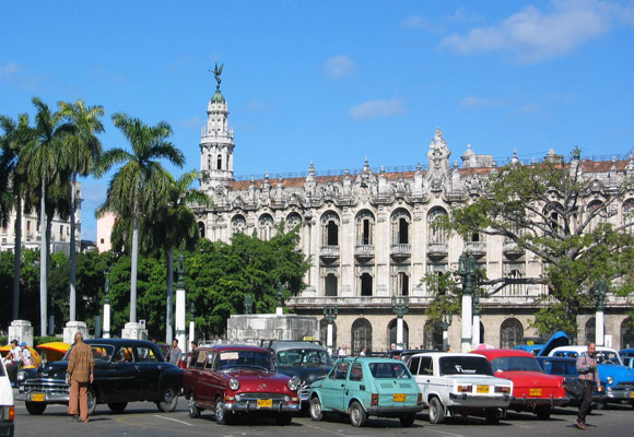 大理石紀念碑,這是1931年古巴人民為了表彰華僑在古巴獨立戰(zhàn)爭中建立的功勛而建。在黑色底座上刻著“在古巴的中國人沒有一個是逃兵,沒有一個是叛徒”的碑文。市內還有1704年建的古老教堂,1721年建的哈瓦那大學,1538—1544年建立的城堡等等。我們的車到了哈瓦那的老城,街道上各種各樣的老牌汽車亂竄,撤下冒著濃重的黑煙,嗆得人喘不過氣來。如果把過去的名貴的老牌轎車比喻為“老爺”車的話,那末,哈瓦那可以稱為:“乞丐”車王國!街上到處開的五、六十年代的蘇聯(lián)、美國的、歐洲的車,有LADA, FORD的車子,噪音很大,尾氣很重,有不少車涂著修補的油漆, 一塊一塊就像迷彩服。