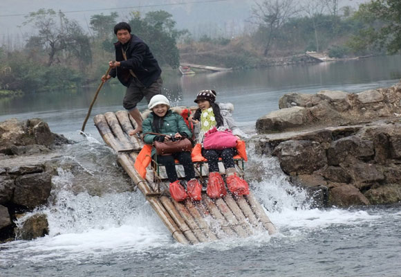 開始就一個浪頭打過來,我和驢友用竹竿撐著筏子左躲右閃,好容易避開浪頭又迎來一堆碎石群,水淺,但更加湍急,我們還來不及尋找支撐點就被水流沖向前去,緊接著浪疊著浪,濕遍全身再濕一遍。刺激,快哉!玩水的妙處正在于此。漸漸地,水面趨于平緩,剛還想在突破水浪后能休息一下,但河水哪能放得過你。“嘩~~~嘩~~~”在我們眼前突然出現(xiàn)了一個水瀑,看樣子水差足有兩米。我們不敢放松一下,緊緊扒住皮筏,握緊竹竿,急速的河水不等我們準備過多,一下子就將我們沖了下去,連人帶筏全翻進水里,剎那間,我們感覺身體和靈魂仿佛在山水間上下翻飛,頭上的飛瀑與腳下的浪花交相輝映,構(gòu)成了一個激情四射的水世界。翻到水里,我頓感緊張,但在全身上下?lián)渫ㄒ环蠓讲虐l(fā)現(xiàn)此處河水不過一米。扶著石塊,慢慢走近卡在石縫中間的皮筏,倒出皮筏里的水,重新?lián)纹痖L長的綠竹竿。