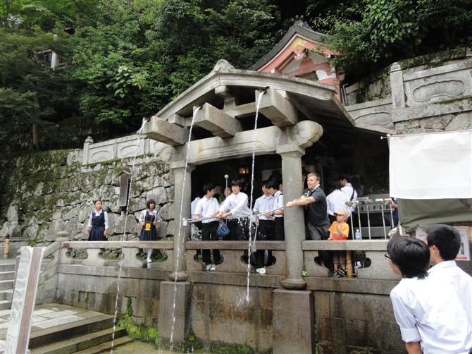 在正殿的北側(cè)有因結(jié)親而聞名的地主神社,因祈愿良緣的年輕男女的到來(lái)而變得熱鬧非凡。神社的院內(nèi)有一對(duì)被稱(chēng)為"戀愛(ài)占卦之石"的石頭,據(jù)說(shuō)閉上眼睛,從一塊石頭摸尋到另一塊石頭,戀愛(ài)就能完美實(shí)現(xiàn)。沿著山路下山,分三路而下的音羽瀑布也不能錯(cuò)過(guò),參拜者們排隊(duì)用舀子汲取清水,以此祈福。