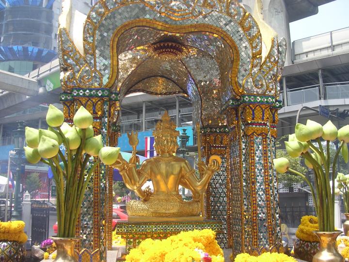 泰國(guó)各地包括住家庭院內(nèi)多有設(shè)置。而以此處香火最為旺盛,從早到晚周圍擺滿了鮮花和香燭等貢品,還可以聘請(qǐng)穿傳統(tǒng)服裝的少女起舞歌唱。該四面佛2006年曾經(jīng)被毀過,現(xiàn)已重新修繕。