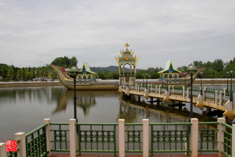 蘇丹奧瑪爾·阿里·賽福鼎的名字命名,紀(jì)念他建國(guó)17年來(lái)的功績(jī)。整個(gè)建筑巍峨高大,莊嚴(yán)肅穆,其巨大圓形金頂和鏤空乳白色尖塔,雄偉豪邁,可供千人禮拜,是當(dāng)之無(wú)愧的伊斯蘭文化中心。清真寺被湖水環(huán)繞,湖面平幽如鏡,一艘仿文萊16世紀(jì)皇家游船的石舫,浮在碧水之中,樹(shù)木繁盛,構(gòu)成一幅美麗的天然圖景。