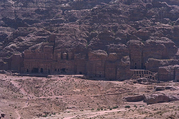 佩特拉古城里約有七百多個(gè)墓冢,而最著名的,要算是皇家墓冢群了,其中規(guī)模最大的是厄恩墓室UrnTomb,墓室內(nèi)呈正方形,高18米,長(zhǎng)寬各20米,在其中說(shuō)話,回聲隆隆不絕。羅馬人占領(lǐng)時(shí)期,下面增建了拱形建筑,設(shè)立了司法人員的辦公室和監(jiān)獄,當(dāng)時(shí)是羅馬帝國(guó)佩特拉行政區(qū)最高的司法機(jī)構(gòu)所在地,所以后人稱此地為“法院”。公元446年,又改為東正教堂。從厄恩墓室順勢(shì)向右,是皇族墓室、科林斯式墓室、宮殿墓室和六瓣花墓室。這五座沿山鑿成的墓室是那霸田王國(guó)幾代國(guó)王和皇族的墓室,它居高臨下、宏偉壯觀,體現(xiàn)了國(guó)王至高無(wú)上的權(quán)力。