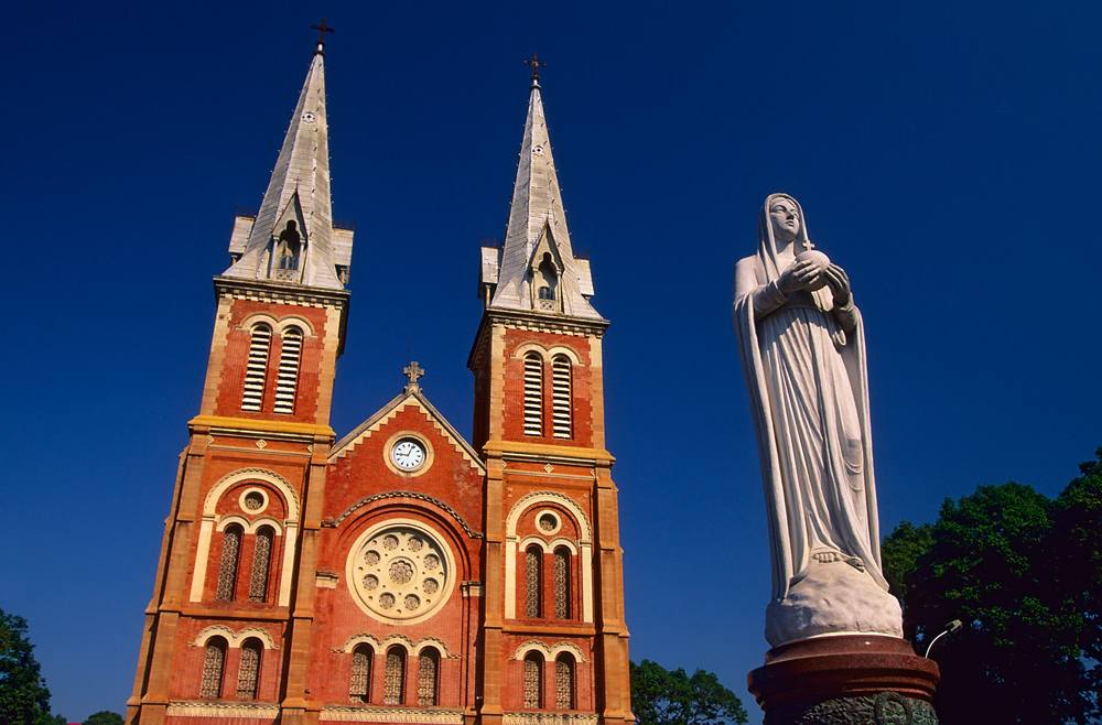 胡志明市圣母大教堂,因使用紅磚建造,又稱紅教堂,是胡志明市最著名的地標。教堂建成于1883年,為法國殖民時期留下的紀念品。